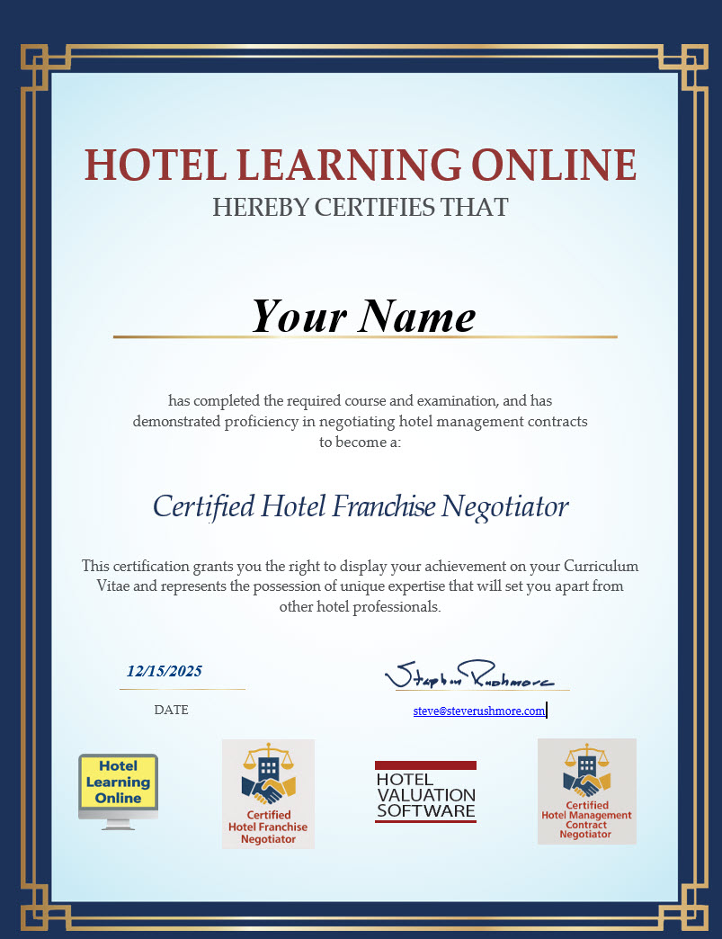 Completing the course earns the Certified Hotel Franchise Negotiator designation, signaling that you can evaluate brands and negotiate franchise agreements with an owner-first mindset that employers and clients immediately recognize as valuable.